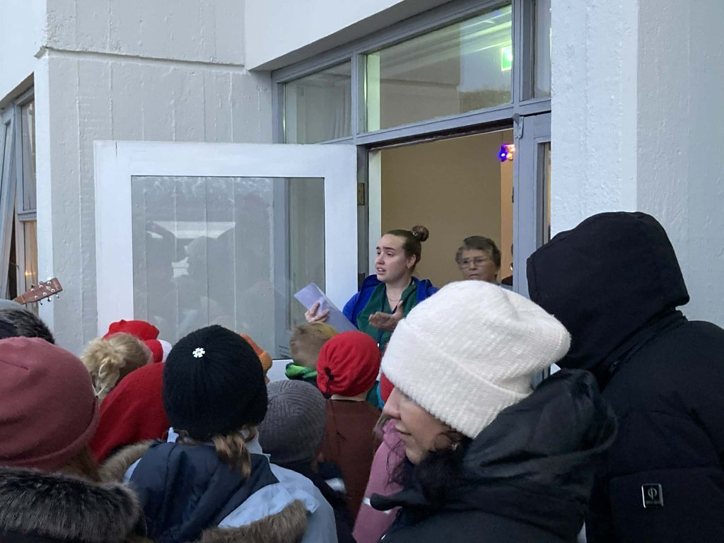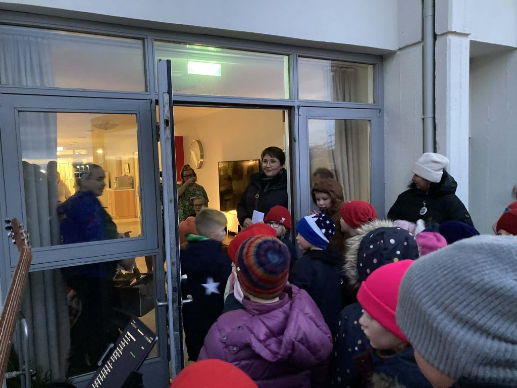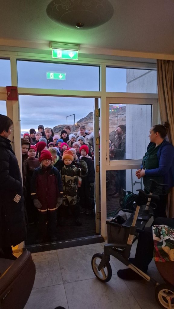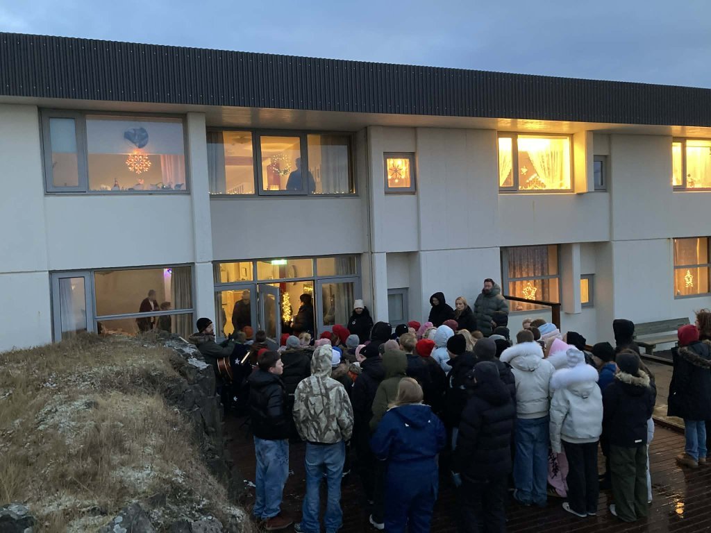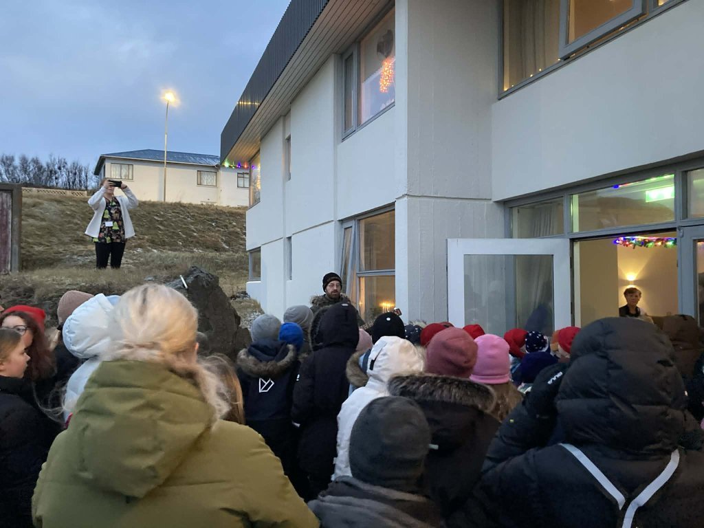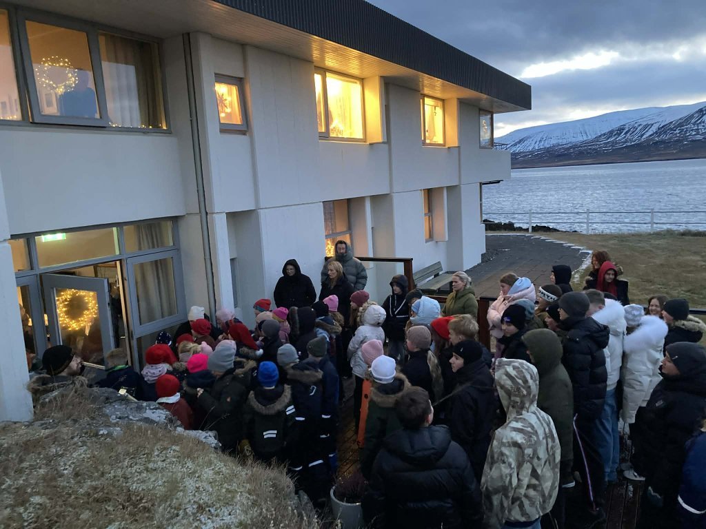 Í dag 15. desember fórum við gangandi inn í Sundabúð, nemendur og starfsfólk, og afhentum gjöfina, sungum nokkur jólalög og þáðum piparkökur og mandarínur. Þetta var mjög ánægjuleg stund sem gaf okkur öllum mikið.